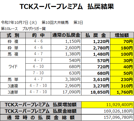 News 2025.10.07 10月7日のTCKスーパープレミアム実施結果について 第10回大井競馬第3日第10競走「プルザトリガー賞」における、TCKスーパープレミアムの実施結果についてお知らせいたします。 競走結果はこちら TCKスーパープレミアムについてはこちら