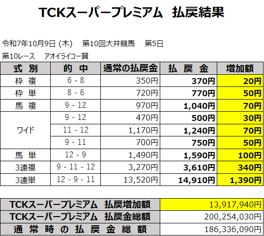 News 2025.10.09 10月9日のTCKスーパープレミアム実施結果について 第10回大井競馬第5日第10競走「アオイライコー賞」における、TCKスーパープレミアムの実施結果についてお知らせいたします。 競走結果はこちら TCKスーパープレミアムについてはこちら