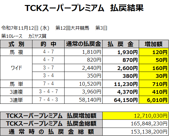 News 2025.11.12 11月12日のTCKスーパープレミアム実施結果について 第12回大井競馬第3日第10競走「カミヤス賞」における、TCKスーパープレミアムの実施結果についてお知らせいたします。 競走結果はこちら TCKスーパープレミアムについてはこちら