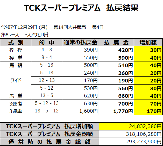 News 2025.12.29 12月29日のTCKスーパープレミアム実施結果について 第14回大井競馬第4日第8競走「ミスアサヒロ賞」における、TCKスーパープレミアムの実施結果についてお知らせいたします。 競走結果はこちら TCKスーパープレミアムについてはこちら