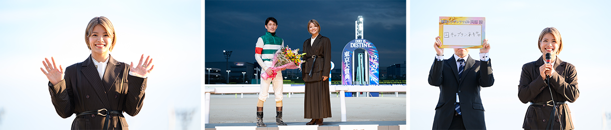 キャプテンネキは惜しくも9着となり的中とはなりませんでしたが、表彰式のプレゼンターを務めた後、阿部さんは勝利ジョッキーの矢野貴之騎手とファンに向けにこやかに手を振り、レース後の興奮冷めやらぬ場内の声援に応えていました。