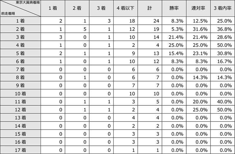 前走の着順別成績を見ると、6着以内の馬は[10-7-8-61](3着内率29.1%)、7着以下の馬は[0-3-2-47](3着内率9.6%)となっている。なお、第61回(平成27年)以降の過去6年に限ると、6着以内の馬は[6-5-5-41](3着内率28.1%)、7着以下の馬は[0-1-1-30](3着内率6.3%)である。大敗直後の馬は評価を下げたい。