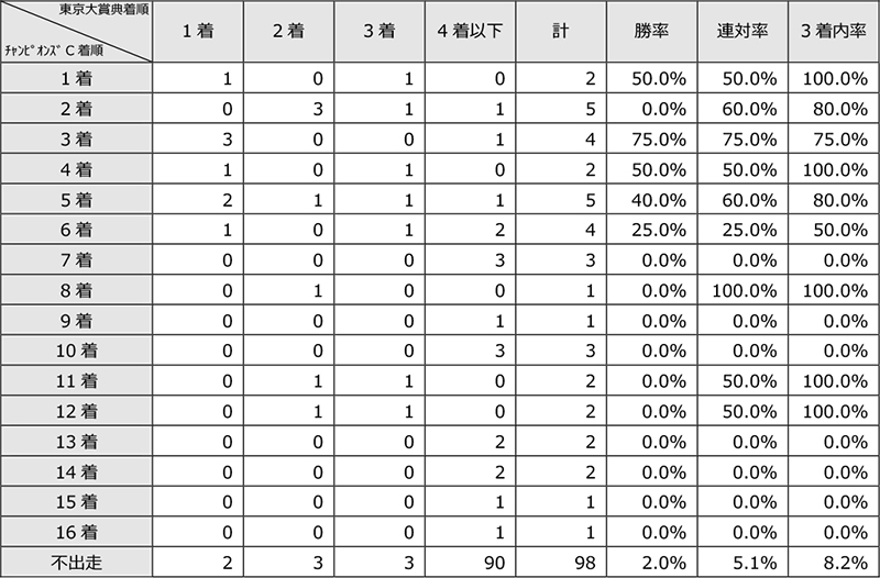 “同年のチャンピオンズC(平成25年までは「ジャパンカップダート」の名称で実施)”における着順別成績を見ると、5着以内の馬は[7-4-4-3](3着内率83.3%)、6~12着の馬は[1-3-3-9](3着内率43.8%)、13着以下の馬は[0-0-0-6](3着内率0.0%)、「不出走」の馬は[2-3-3-90](3着内率8.2%)となっている。直近のビッグレースである “同年のチャンピオンズC”において善戦した馬は高く評価すべきだろう。