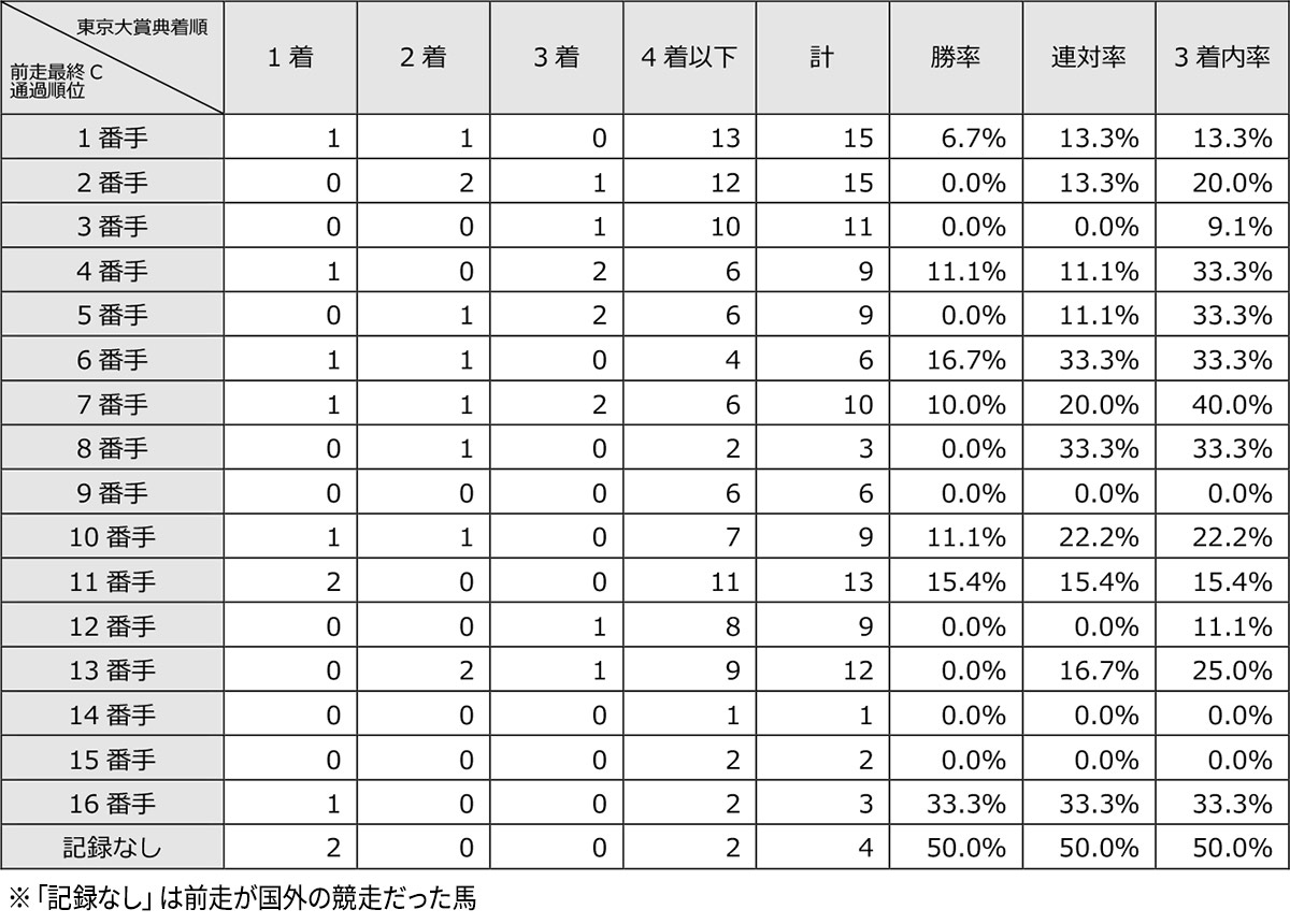 前走の最終コーナー通過順別成績を見ると、3番手以内の馬は[1-3-2-35](3着内率14.6%)、4~10番手の馬は[4-5-6-37](3着内率28.8%)、11番手以下の馬は[3-2-2-33](3着内率17.5%)、「記録なし」の馬は[2-0-0-2](3着内率50.0%)となっている。なお、第65回(令和元年)以降の過去6年に限ると、3番手以内の馬は[0-2-1-23](3着内率11.5%)、4~10番手の馬は[4-3-5-17](3着内率41.4%)、11番手以下の馬は[0-1-0-17](3着内率5.6%)、「記録なし」の馬は[2-0-0-2](3着内率50.0%)である。前走で先行していた馬や、その逆に極端な後方からレースを進めていた馬は、割り引きが必要だ。