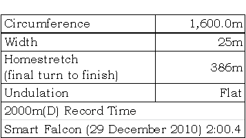 For the 2,000m races the horses start on the point 400m to the winning post. Horses running on this race draw slight advantage from the post position since the race starts with straight length of about 500m before the first turn.